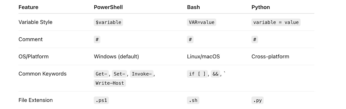 $varappears in PowerShell and shells. Look for cmdlets (Get-,Write-Host) for PowerShell vs typical Unix commands for Bash.