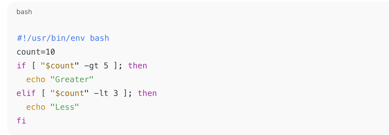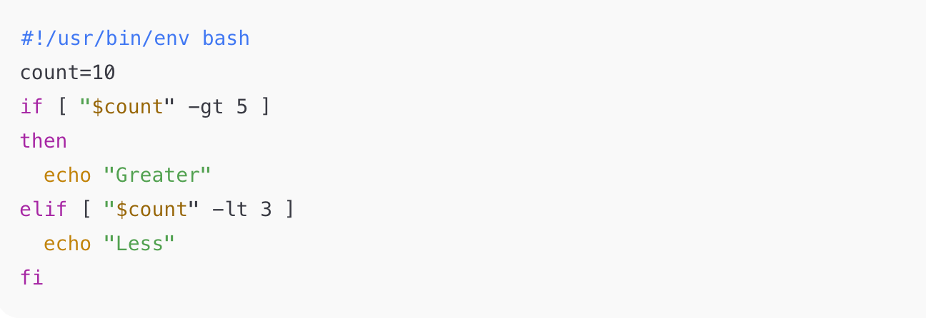Why: The primary problem with this Bach snippit is the elif branch lacks the required then keyword (elif [ condition ] ; then). That results in a shell parse error. (Note: quoting “$count” is good practice — it avoids word-splitting if empty.)
