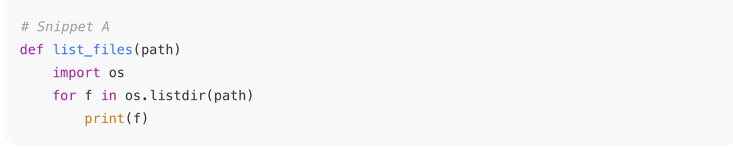 Why: In this Python script snippet, both the def and for statements are missing the required trailing colon (:). That produces a SyntaxError before the code runs.